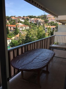 The big project for this year, though, was the installation of awnings on the balcony. Over the years, we have considered several options for keeping the sun off the balcony when it’s not wanted, and for protecting us from the wind. Some residents have their balconies enclosed in glass. Others have awnings that crank out at an angle. We chose the third option, that of awnings that come straight down. Because our balcony is double in length, it needed two awnings, which actually makes it so much more flexible. I insisted that we have them electrified with remote controls, so we could move them up or down from the living room or even without getting out of bed in the morning. So before leaving the States, I had mailed our signed devis and check to the window company in our village. Because of the weather and the tramontane blowing its usual spring wind, this installation was delayed two months. But finally, the men were ready to come and install our awnings, as well as matching material on the outside of the railing, which provides a bit of privacy. Madame, in their office, said I’d been a bonne sport for waiting so patiently. They had predicted that it would be a half-day job, but they were working from 8 a.m. 4 p.m.