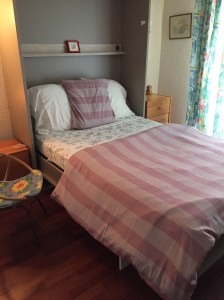 My best friend came to visit overnight and helped me put together all the linens for the Murphy bed. We quickly discovered that I couldn’t put on the zippered mattress cover as the mattress was strapped to the frame. So that was a useless purchase. But the mattress padded cover, sheets, light blanket and comforter were soon in place. I commissioned my friend to paint a frieze on the long white panel—a beach scene with a young couple and two cats following them, then two children playing near the water’s edge. Perhaps someday this will be accomplished!