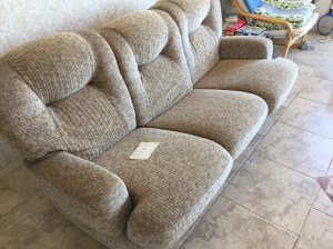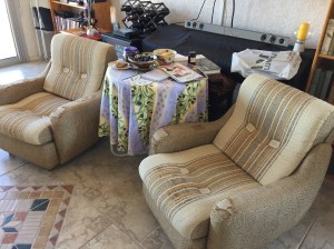 Then the two “comfy” chairs in the living room were leftovers from the previous apartment owner and the material was all worn away on the arms, plus they, too, sunk so far down that I felt I was practically sitting on the floor.