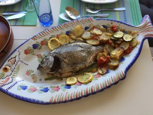 While we waited to hear from our gas company about the new radiators, I enjoyed visiting all the shops downtown, particularly the poissonerie and buying lots of fresh fish. I discovered a new fish, which I’d never seen before. It is called a sar and is like a fat dorade, which is bream, in English.
